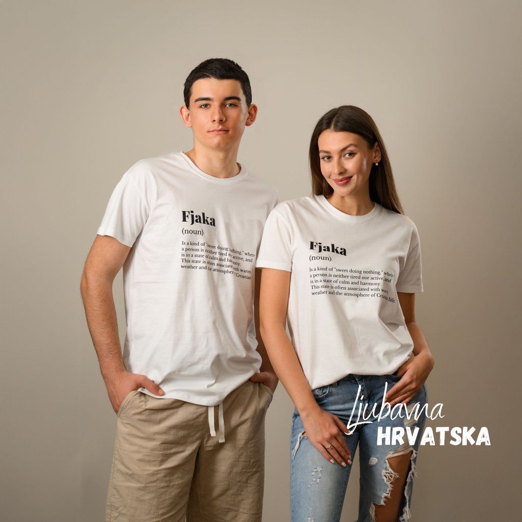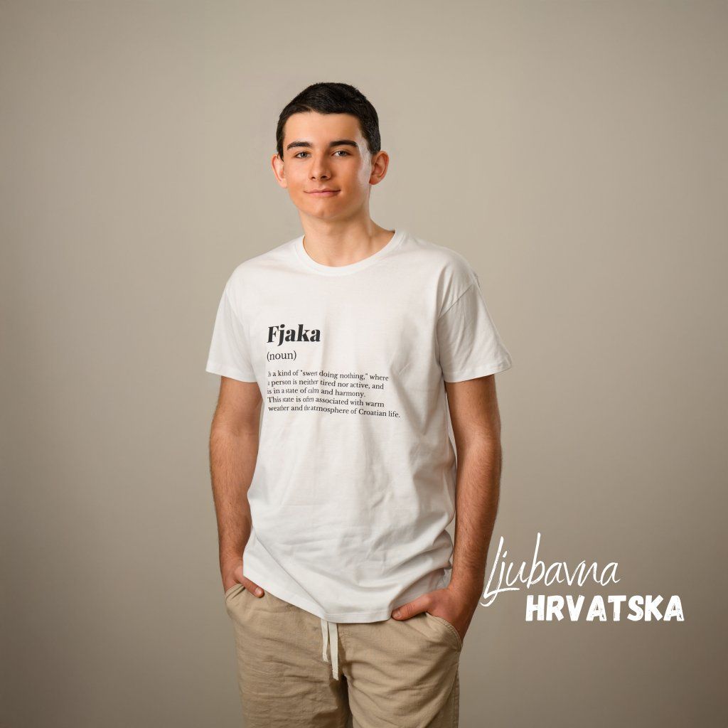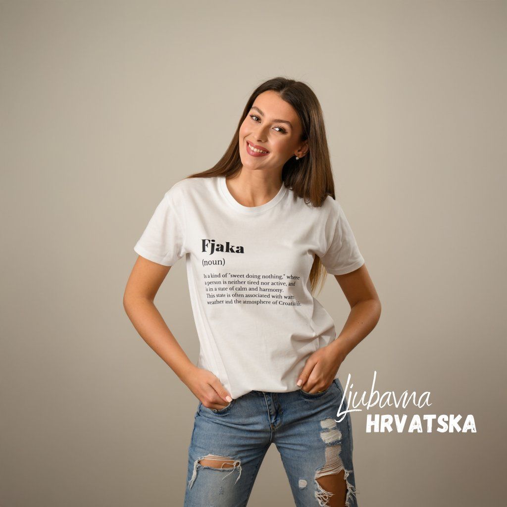 White short-sleeve T-shirt. FJAKA print. Suitable for both women and men as a reminder of Dalmatia. The T-shirt was created as a summer 2025 collection, inspired by a love for Croatia.